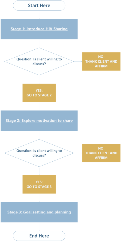• Suggests that HIV sharing counselling is best done in stages – introducing HIV sharing, then exploring motivation to share, then goal setting and planning